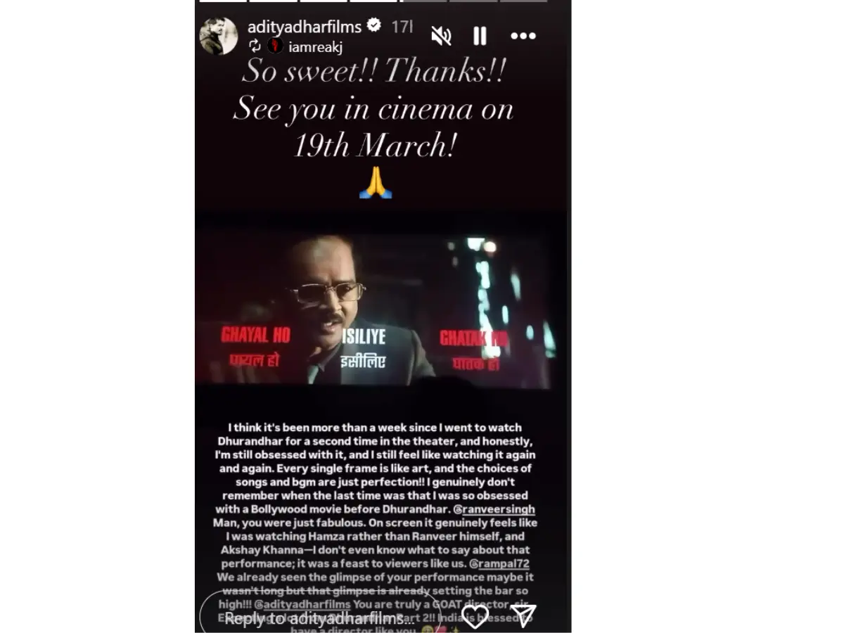 Hailing Ranveer's movie, one fan wrote, “I think it is more than a week since I went to watch Dhurandhar for a second time in the theatre and honestly, I am still obsessed with it, and I still feel like watching it again and again… You are truly a GOAT director, can't wait for Dhurandhar 2! India is blessed to have a director like you!”