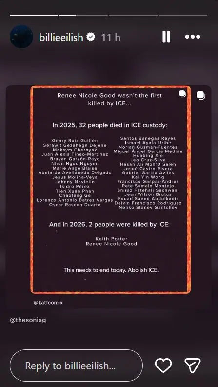 She also reposted another message in which it called for complete abolition of ICE and listed the names of 32 individuals who reportedly died in the agency's custody over the past year. She has also urged her American followers to contact their congressional representatives to demand that the agency be defunded and that the officer responsible for the shooting be arrested and charged.