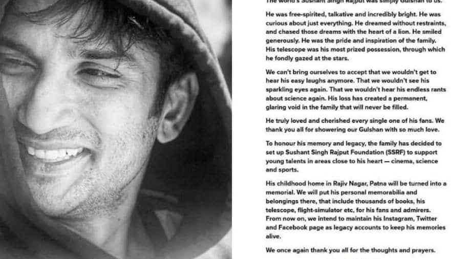 To honour his memory and legacy, the family has decided to set up Sushant Singh Rajput Foundation (SSRF) to support young talents in areas close to his heart - cinema, science and sports.
