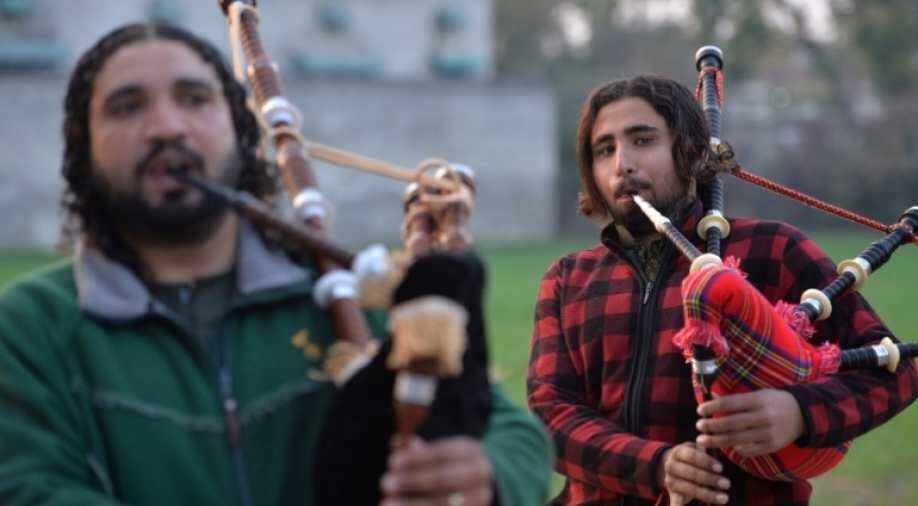 Pakistani musical band perform with bagpipes made at the Mid East bagpipe factory in the eastern city of Sialkot. Photograph:( AFP )
