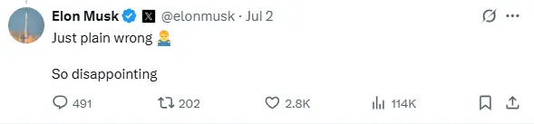In a post on X, Musk responded to a tweet criticising the president’s Truth Social post threatening to scrap federal subsidies received by his companies, writing that the remarks were: “Just plain wrong...So disappointing.” He also said that he is tempted to escalate the situation but he won't. The billionaire also made a post urging people to follow a meme account posting screenshots of old tweets by GOP lawmakers criticising the national debt alongside posts hailing the passage of tax and spending bill.