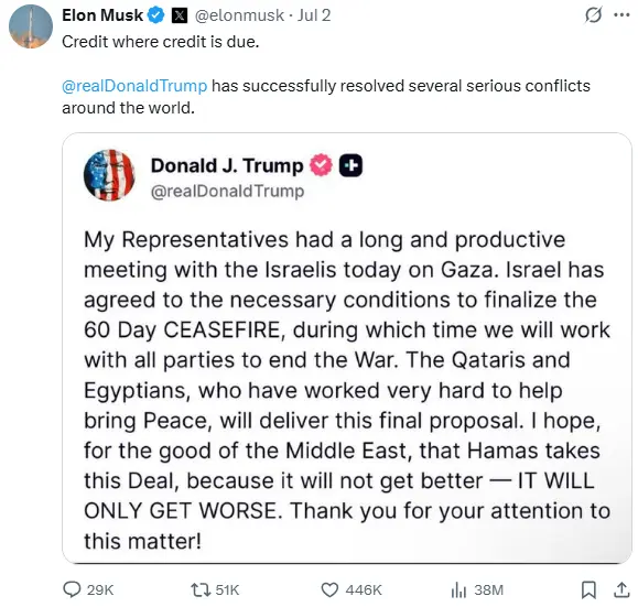 However, after a few hours, when Trump shared a post about a ceasefire between Israel and Hamas to stop the war in Gaza, the tech giant wrote: “Credit where credit is due...[Trump] has successfully resolved several serious conflicts around the world.”