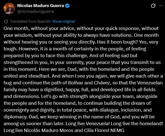 “Has it been tough? Yes, very tough. However, it is a month of certainty in the people, of feeling prepared by you to face this challenge. And of feeling sad but strengthened in you, in your serenity, your peace that you transmit to us in this moment. Here we are, Dad, with the homeland and the people united and steadfast. And when I see you again, we will give each other a hug and continue the path of Bolívar and Chávez, so that the Venezuelan family may have a dignified, happy, full, and developed life in all fields and dimensions.Long live Venezuela! Long live the homeland! Long live Nicolás Maduro Moros and Cilia Flores!” he wrote in his message.