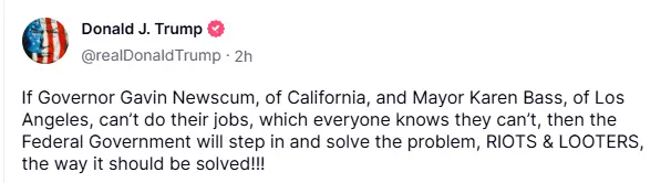 Trump also responded to the development on his Truth Social platform. He wrote, “If Governor Gavin Newscum, of California, and Mayor Karen Bass, of Los Angeles, can’t do their jobs, which everyone knows they can’t, then the Federal Government will step in and solve the problem, RIOTS & LOOTERS, the way it should be solved!!!”