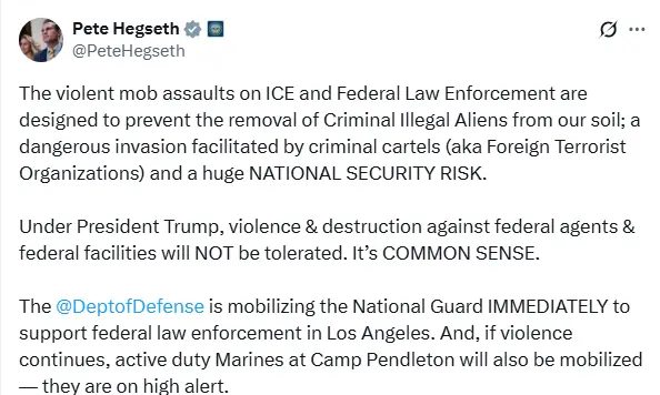 Leavitt's statement came after Trump's border czar, Tom Homan said in a TV interview that National Guards will be deployed. Moreover, US Defense Secretary Pete Hegseth said that the Pentagon was prepared to mobilize active duty Marines "if violence continues" in Los Angeles.