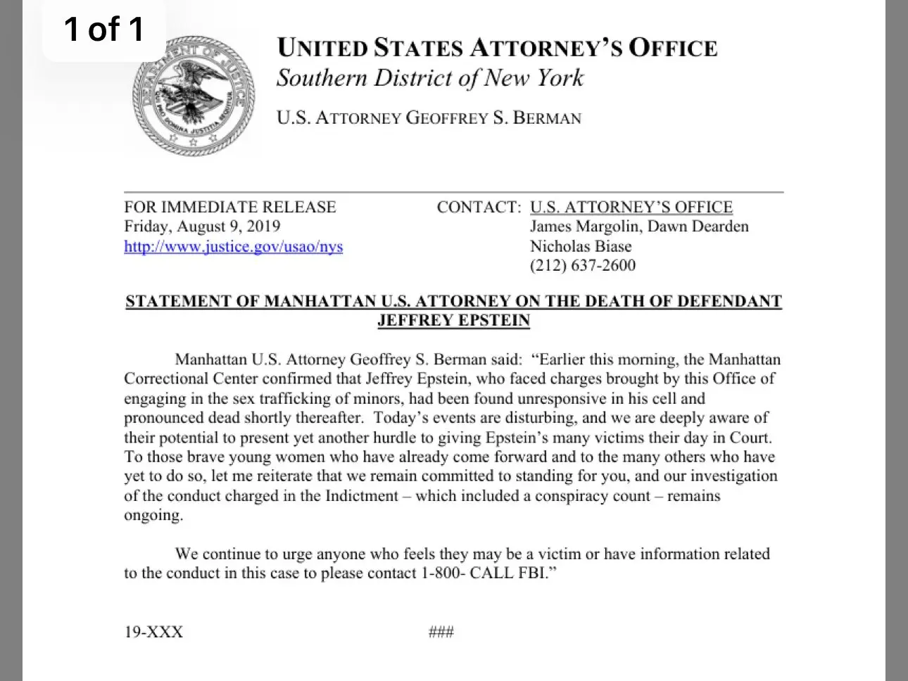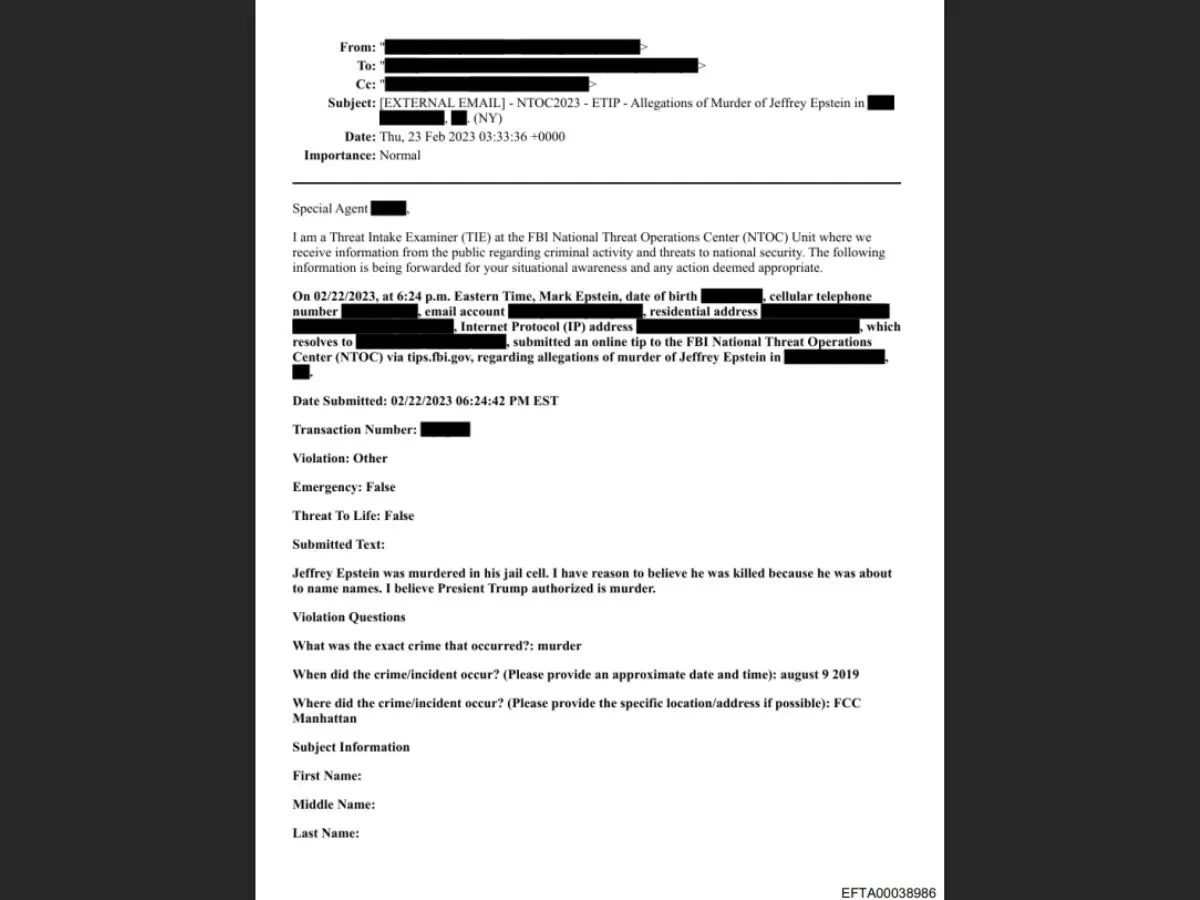 “Jeffrey Epstein was murdered in his jail cell. I have reason to believe he was killed because he was about to name names. I believe President Trump authorised the murder,” read the tip as jotted down by the Threat Intake Examiner (TIE) at the FBI National Threat Operations Centre (NTOC). The FBI categorised the threat as false. Incidently the supposed suicide occurred in the early hours of August 10, 2019, but the official statement mentions the date as August 9, 2019.