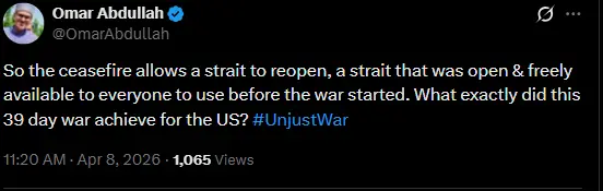 Several European leaders, in a joint statement: We welcome the two-week ceasefire concluded between the United States and Iran today. The goal must now be to negotiate a swift and lasting end to the war within the coming days. This can only be achieved through diplomatic means.