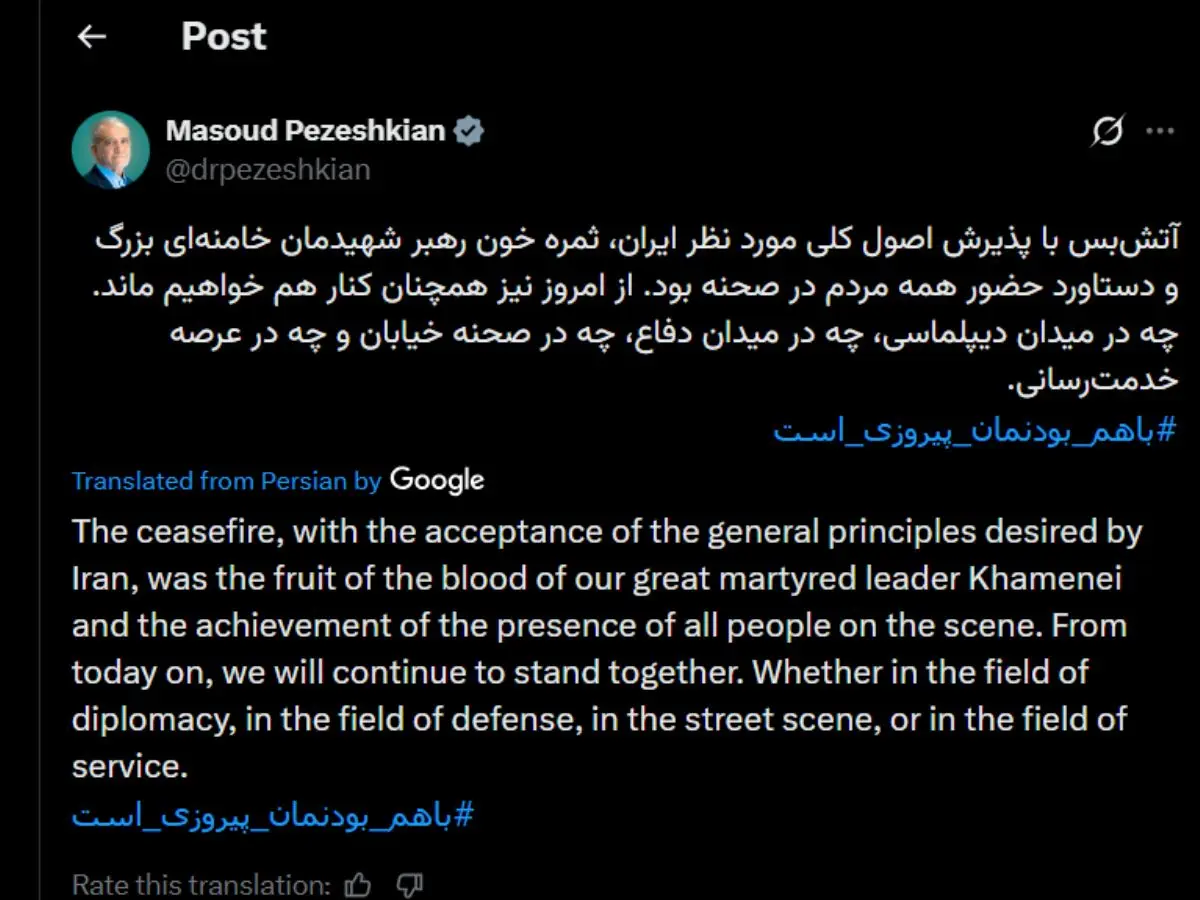 Iranian President Masoud Pezeshkian hailed the two-week ceasefire with the acceptance of the desired principle by Iran, as a fruit of the “blood” of the martyred leader Ayatollah Ali Khamenei and the presence of all Iranian people.