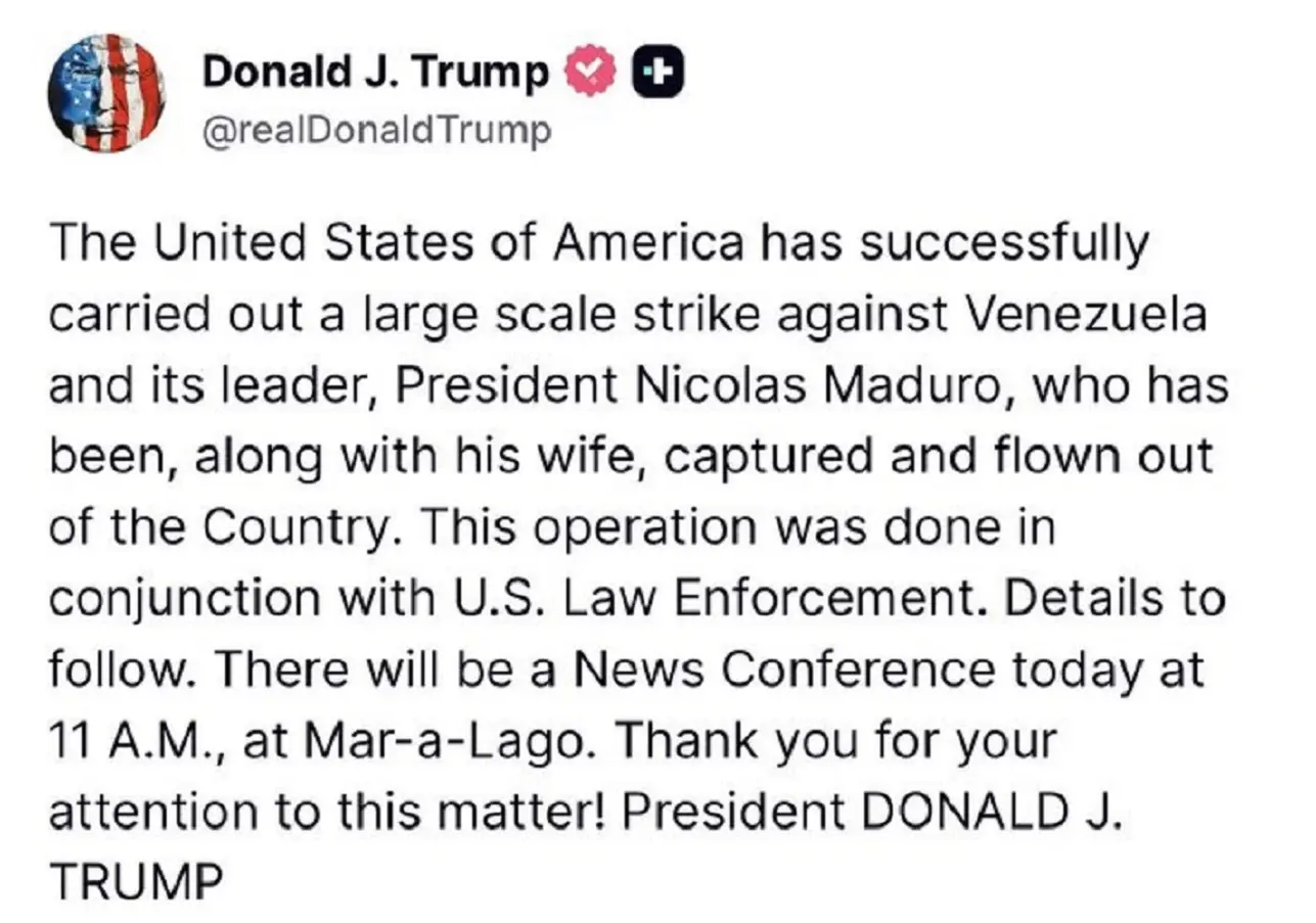 In a post on Truth Social, Trump wrote, “The United States of America has successfully carried out a large scale strike against Venezuela and its leader, President Nicolas Maduro, who has been, along with his wife, captured and flown out of the Country. This operation was done in conjunction with U.S. Law Enforcement. Details to follow. There will be a News Conference today at 11 A.M., at Mar-a-Lago. Thank you for your attention to this matter! President DONALD J. TRUMP’