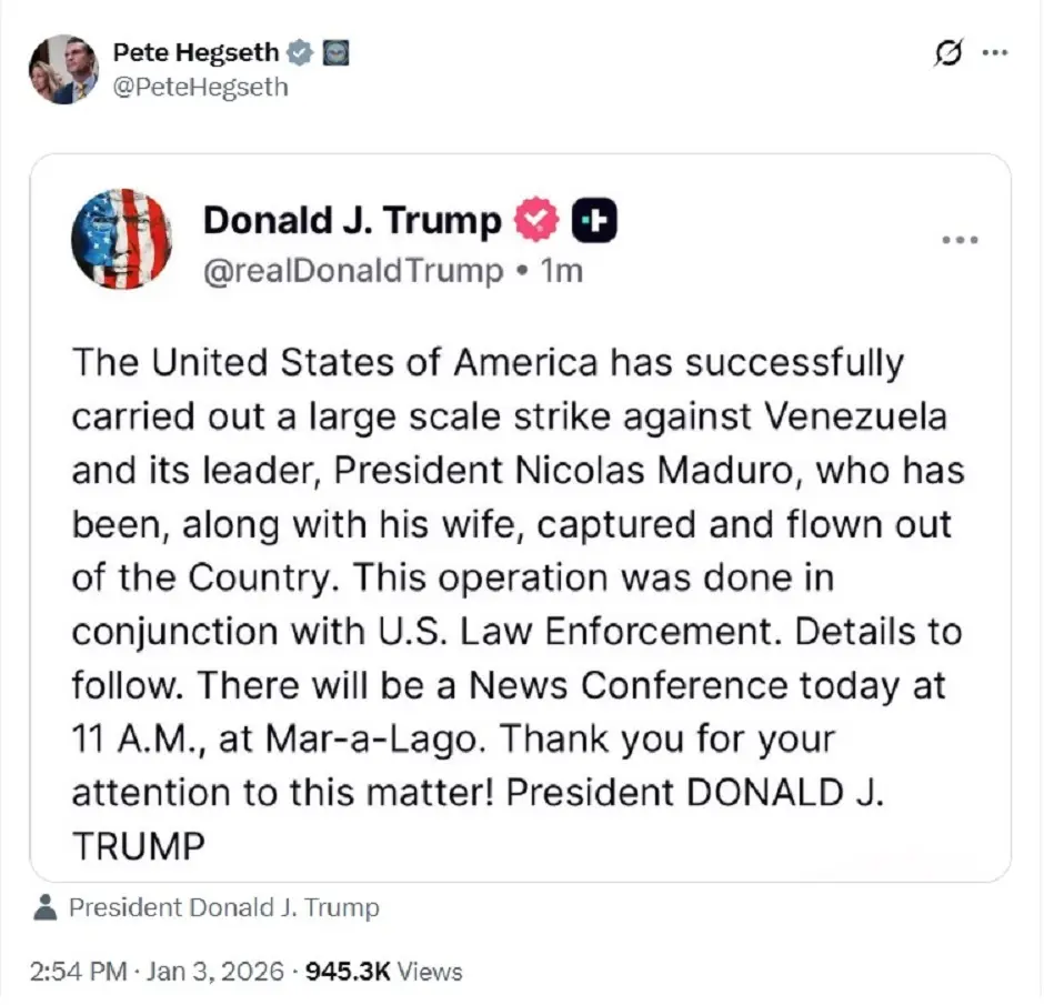 The US Secretary of War Pete Hegseth has also confirmed the US military action in Venezuela and has reposted President Donald Trump's Truth Social post.