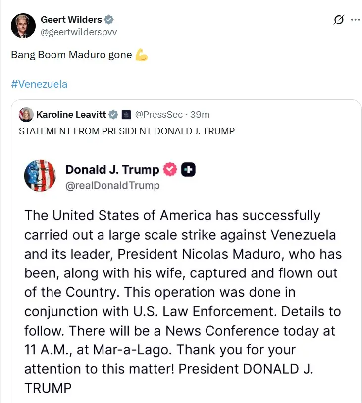 Dutch politician, Geert Wilders, who heads the far-right Party for Freedom (PVV) in the Netherlands and is known for his right-wing populism, anti-immigration, opposition to Islam, and Euroscepticism, has reposted Donald Trump’s Truth Social post, commenting, “Bang Boom Maduro gone.”