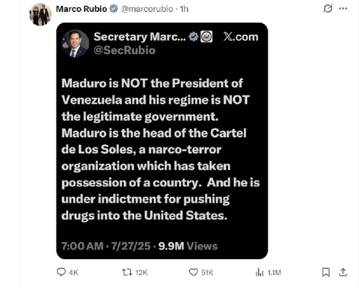 US Secretary of State Marco Rubio reposted a statement from July about President Nicolás Maduro on Saturday morning. In the original post, Rubio noted that in 2020 Maduro was charged by US prosecutors with narco-terrorism, corruption, drug trafficking and other criminal charges.
